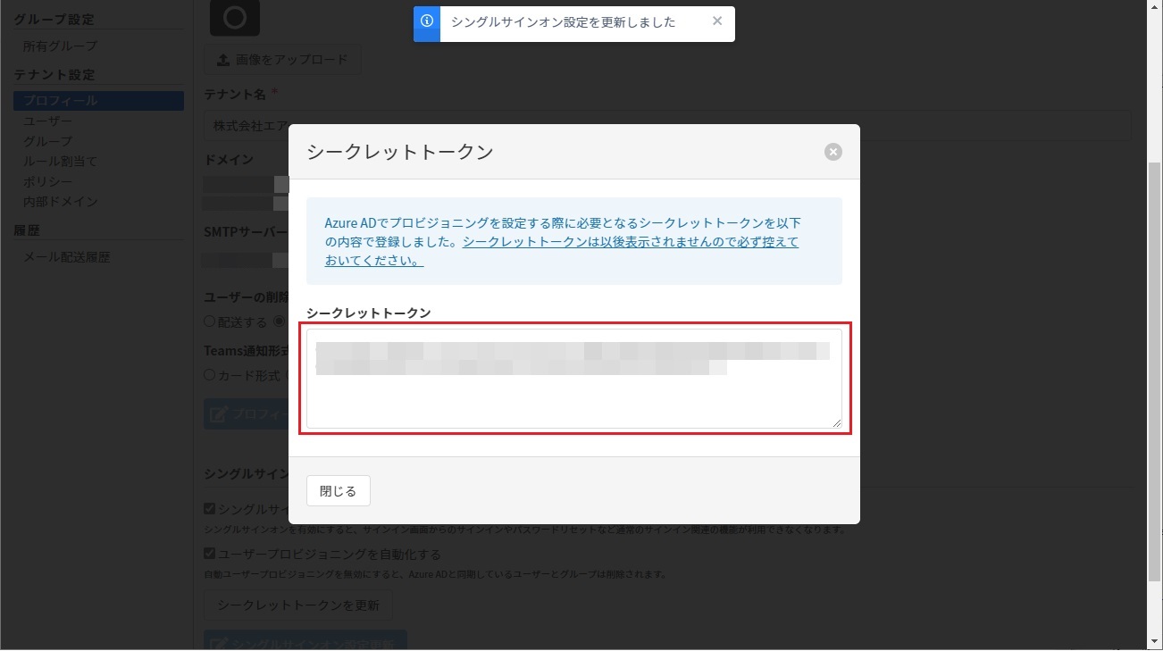 以下の画面が表示されます。画面に表示されたシークレットトークンは、後の手順で使用するため、メモしておきます。