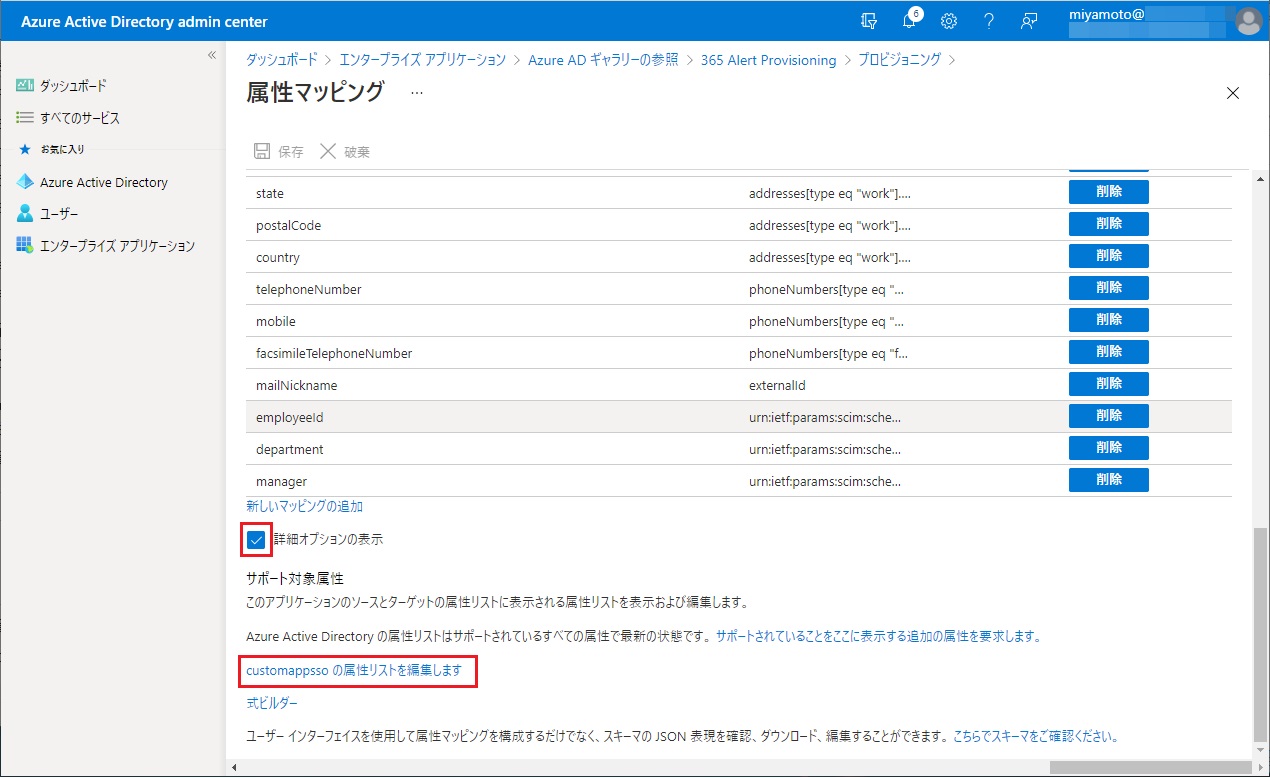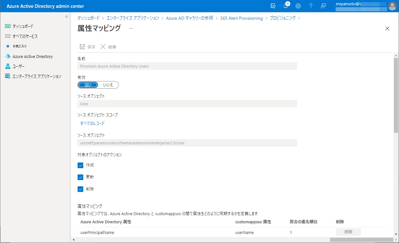 「ソース属性」でメールエイリアスとして同期させたいAzure ADの属性を選択します。以下は、userPrincipalNameを同期項目として選択した場合の設定例です。メールエイリアスを設定する際の注意点についてはこちらを参照してください。