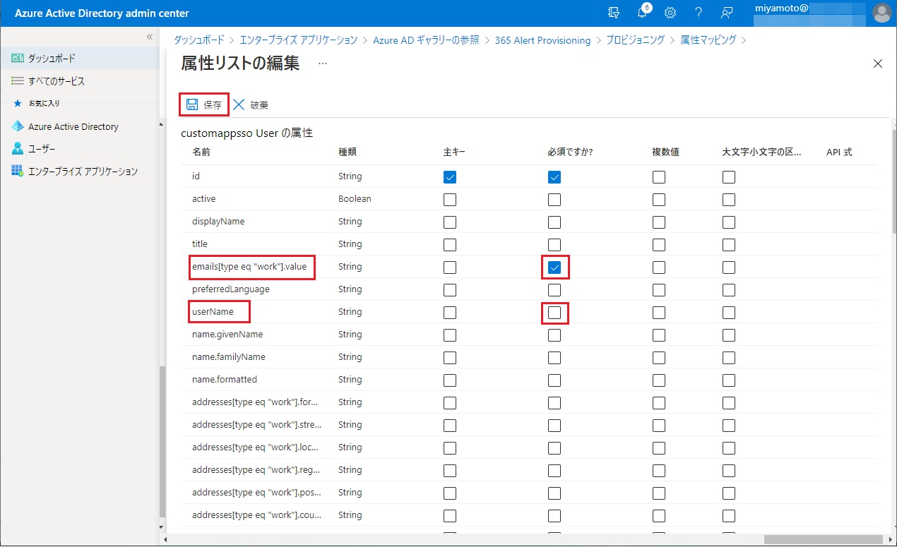 - 名前が「emails[type eq "work"].value」の行の「必須ですか?」列にチェックを付けます。