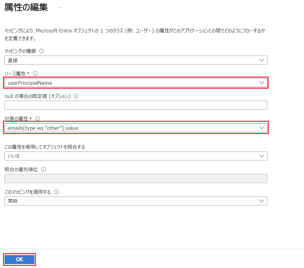 - Azure Active Directory 属性が「mail」の行をクリックし以下の編集を行います。