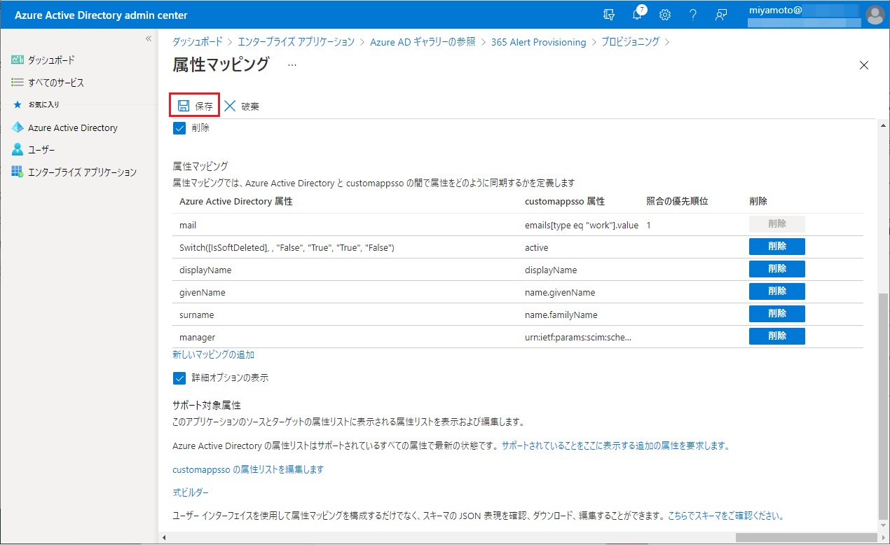 [属性マッピング]セクションで以下のようにマッピングの編集を行います。