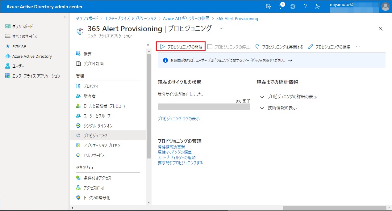 自動プロビジョニングを開始すると約40分間隔で同期処理が実行されます。そのため、Azure ADで行った変更の反映に最大40分程度かかりますのでご注意ください。