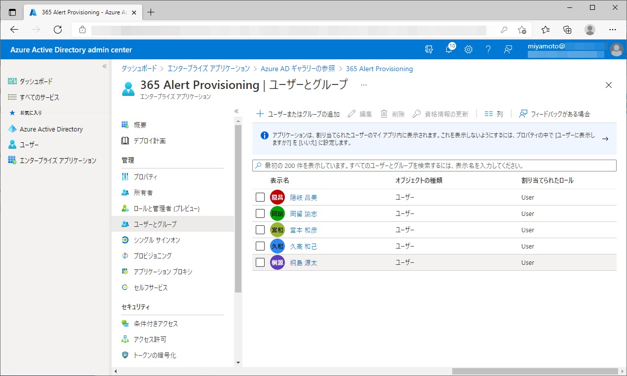 note365 Alertの設定でユーザープロビジョニングの自動化を解除すると、Azure ADから同期されているユーザーは全て365Alertから削除されます。 そのため、365 Alertのテナント管理者は同期対象にせず、「365 Alert管理ポータル」からユーザー登録を行うことを推奨します。