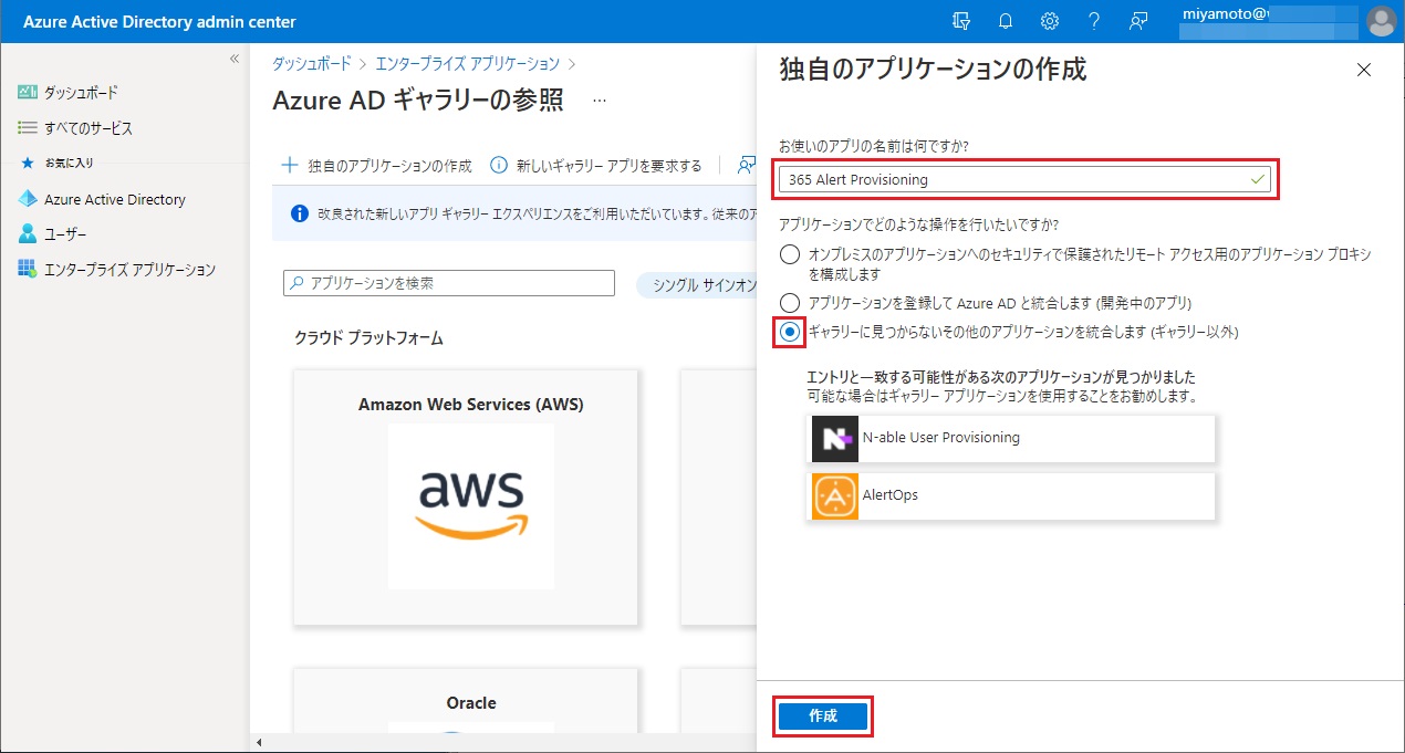 以下画面で、アプリケーションの名前に「365 Alert Provisioning」と入力し、[ギャラリーに見つからないその他のアプリケーションを統合します (ギャラリー以外)]オプションを選択して、[作成]をクリックします。