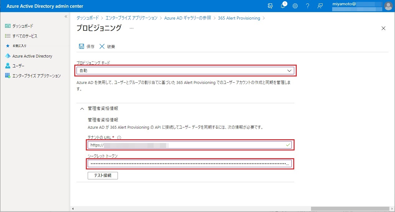 - [テナントの URL]フィールドに、「自動プロビジョニングURL」(取得方法は下記NOTE参照)を入力します。