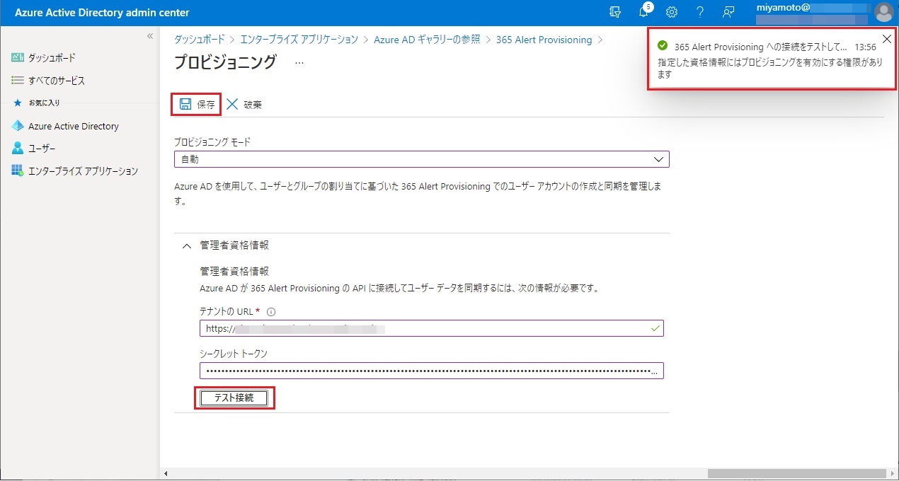 [テスト接続]をクリックして、Azure Active Directory による SCIM エンドポイントへの接続を試みます。