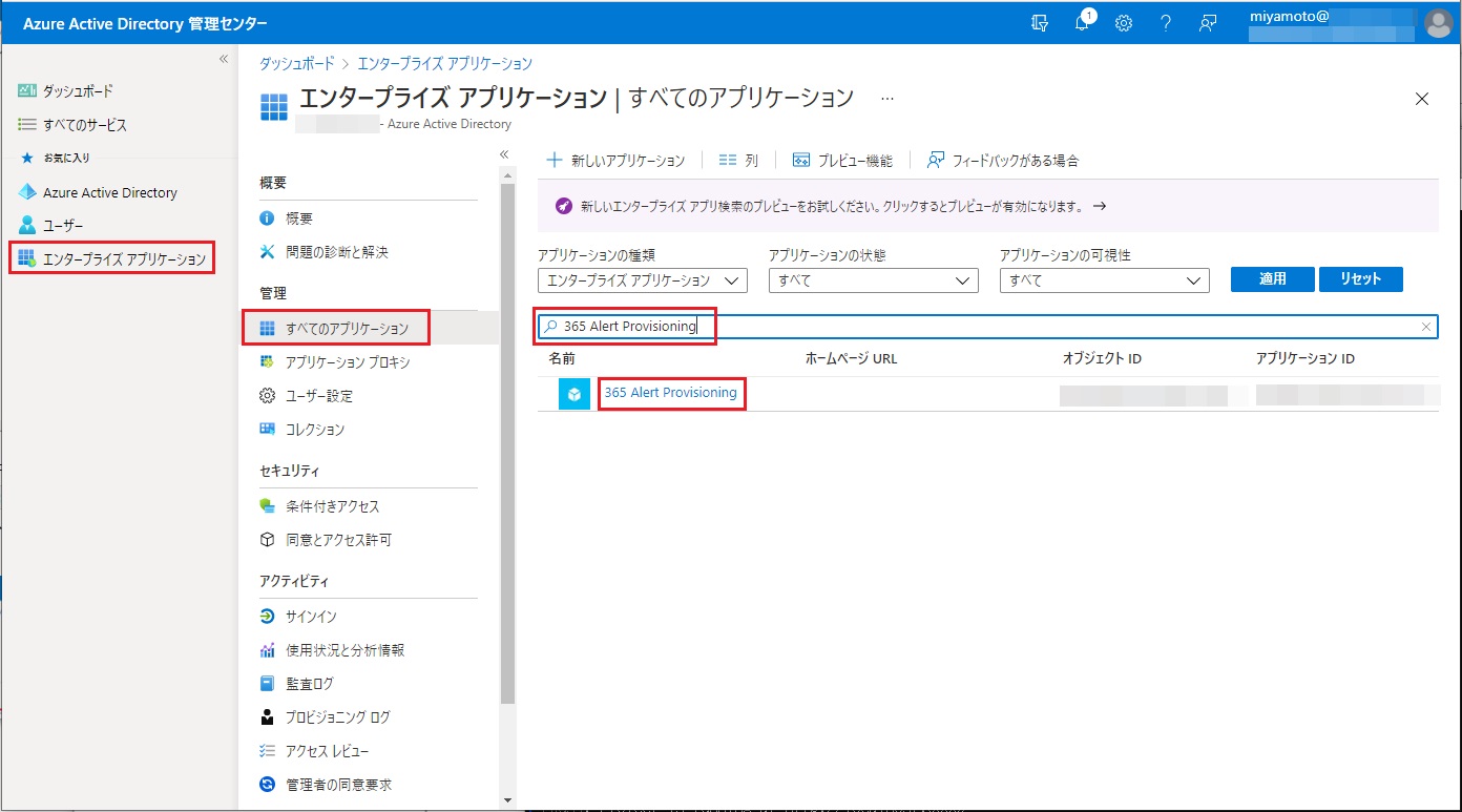 表示された画面で、検索ボックスに365 Alert Provisioningと入力して、表示された[365 Alert Provisioning]をクリックします。