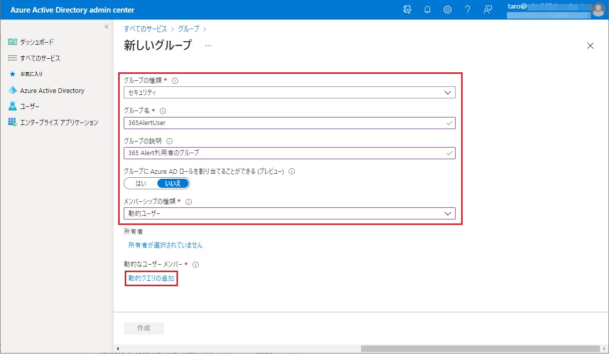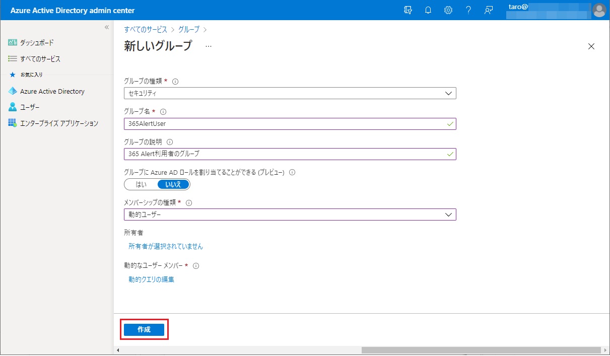 以下では、動的グループを使用して、自動で365 Alertに同期するユーザーを割り当てる方法を記載します。