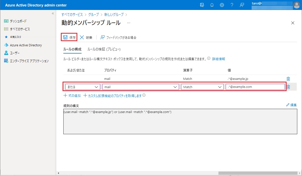 例えば、テナント管理者admin@example.jpとadmin@example.comを動的グループから除外する場合は[規則の構文]の[編集]リンクをクリックして、下記の規則を記入してください。((user.mail -match ".*@example.jp") or (user.mail -match ".*@example.com")) and (user.mail -ne "admin@example.jp") and (user.mail -ne "admin@example.com") -