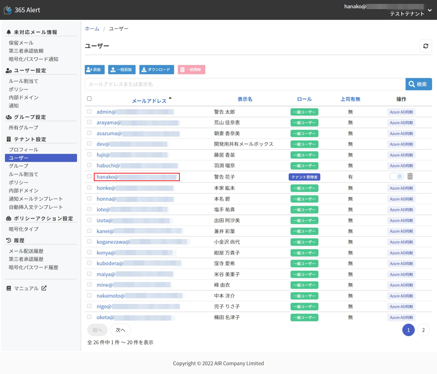 画面左のメニューから[テナント設定]の[ユーザー]をクリックします。