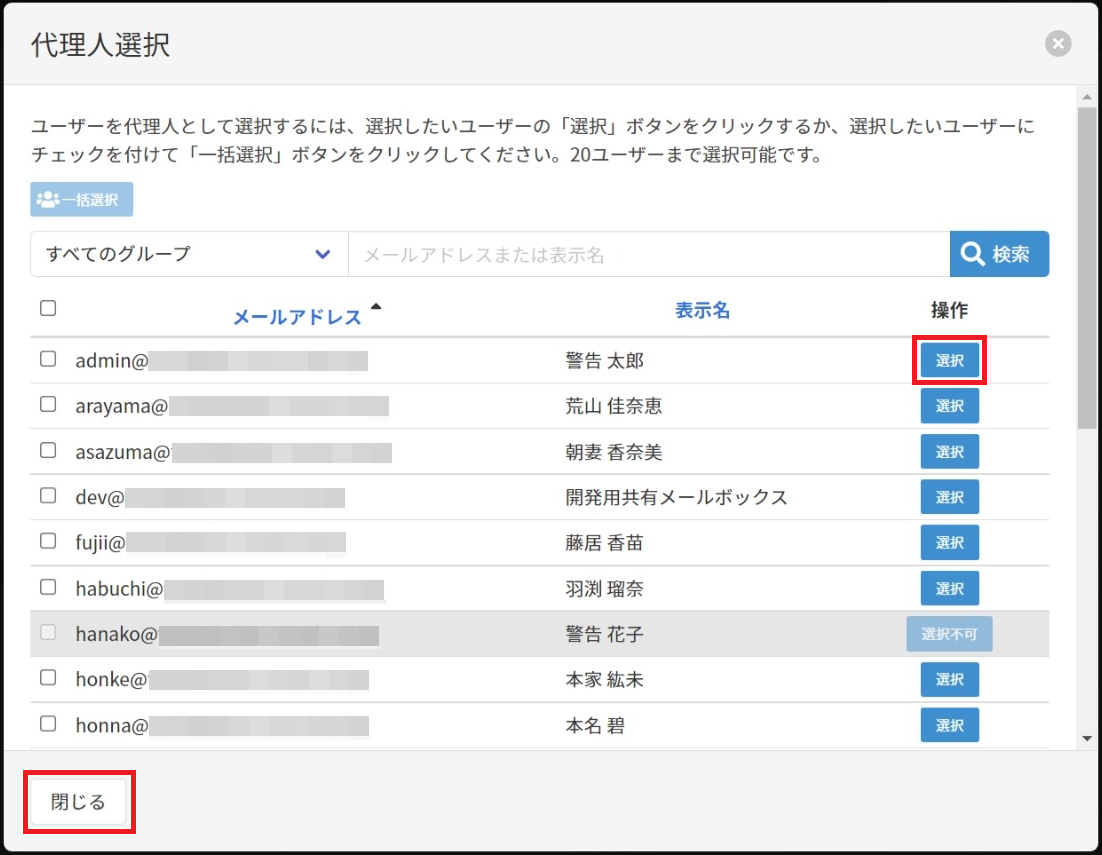 以下の画面が表示されますので、対象ユーザーの代理人となるユーザーを選択し 、[閉じる]ボタンをクリックします。代理人は20ユーザーまで選択可能です。