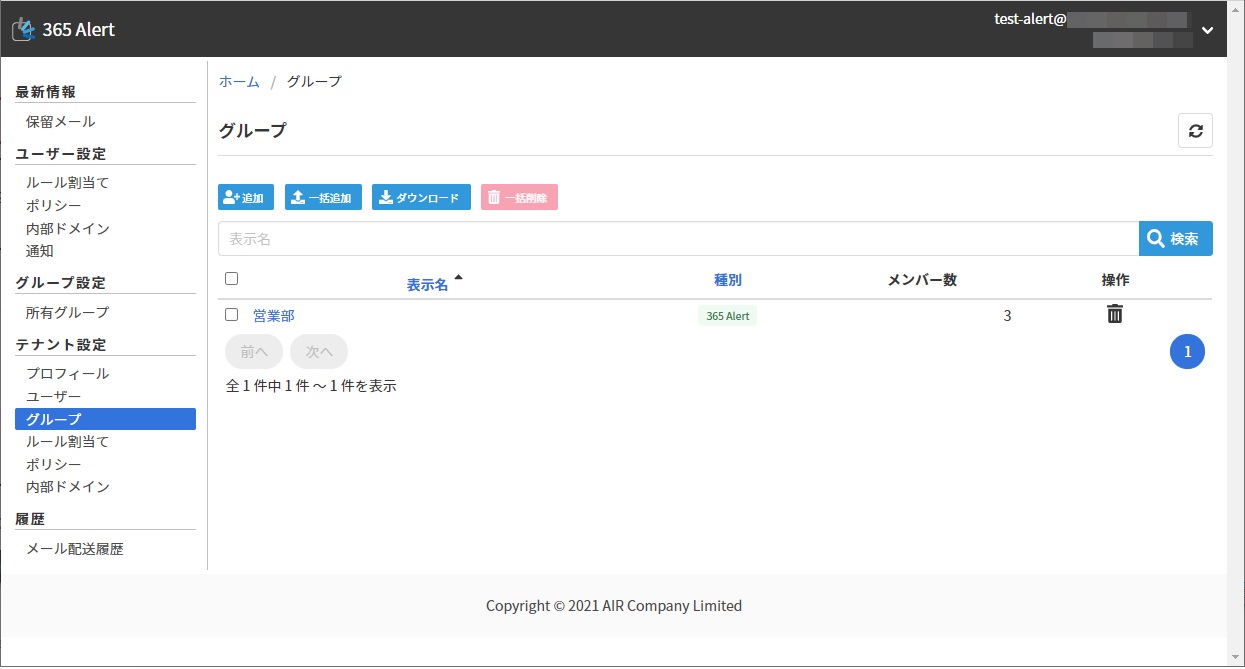 365 Alertでは、グループを作成してグループ単位でルールやポリシーを設定することが可能です(365 AlertグループとAzure ADグループ)。