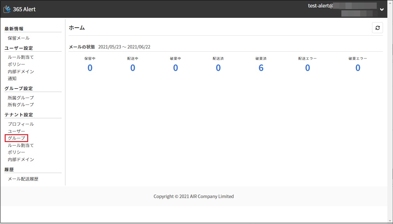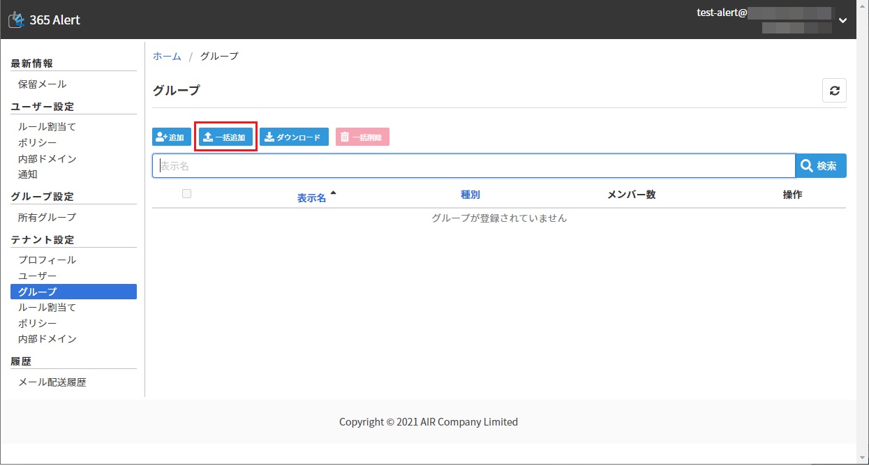 画面左のメニューから[テナント設定]の[グループ]をクリックします。