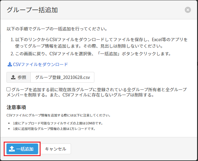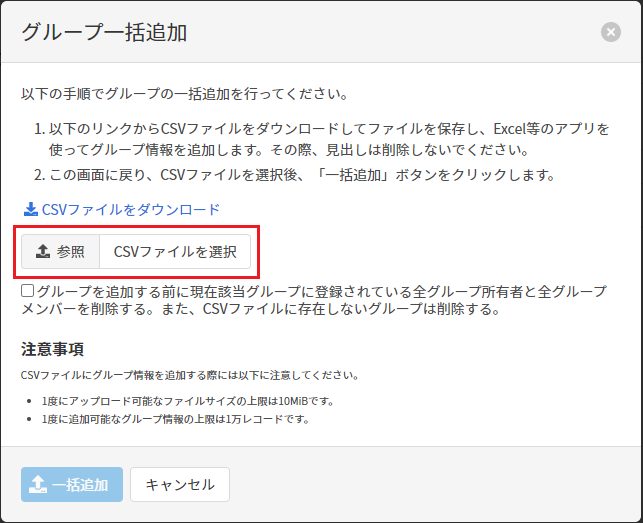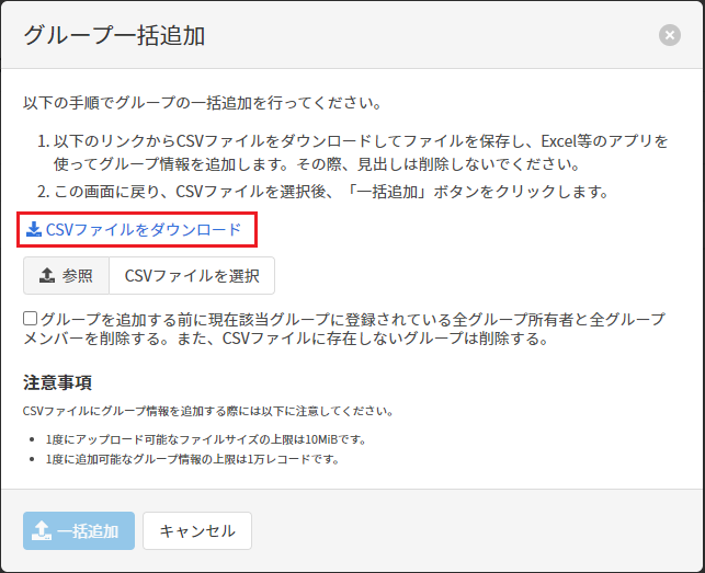 ここではCSVファイルを使用して、一括してグループを登録する方法を記載します。