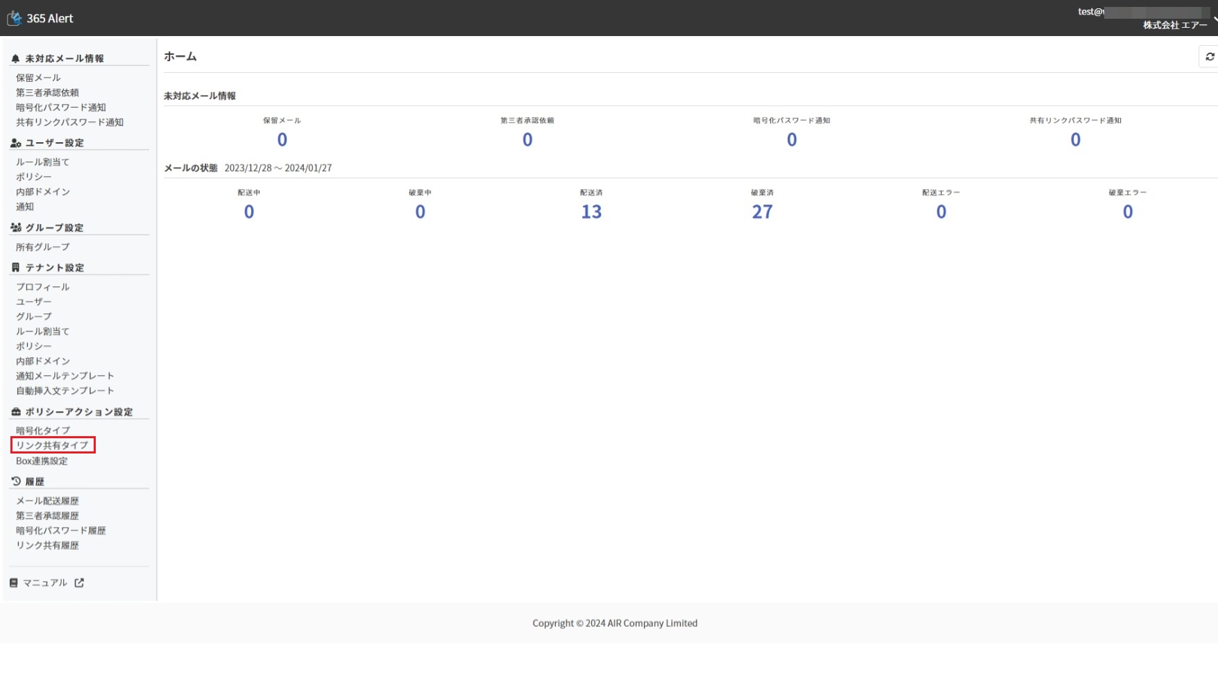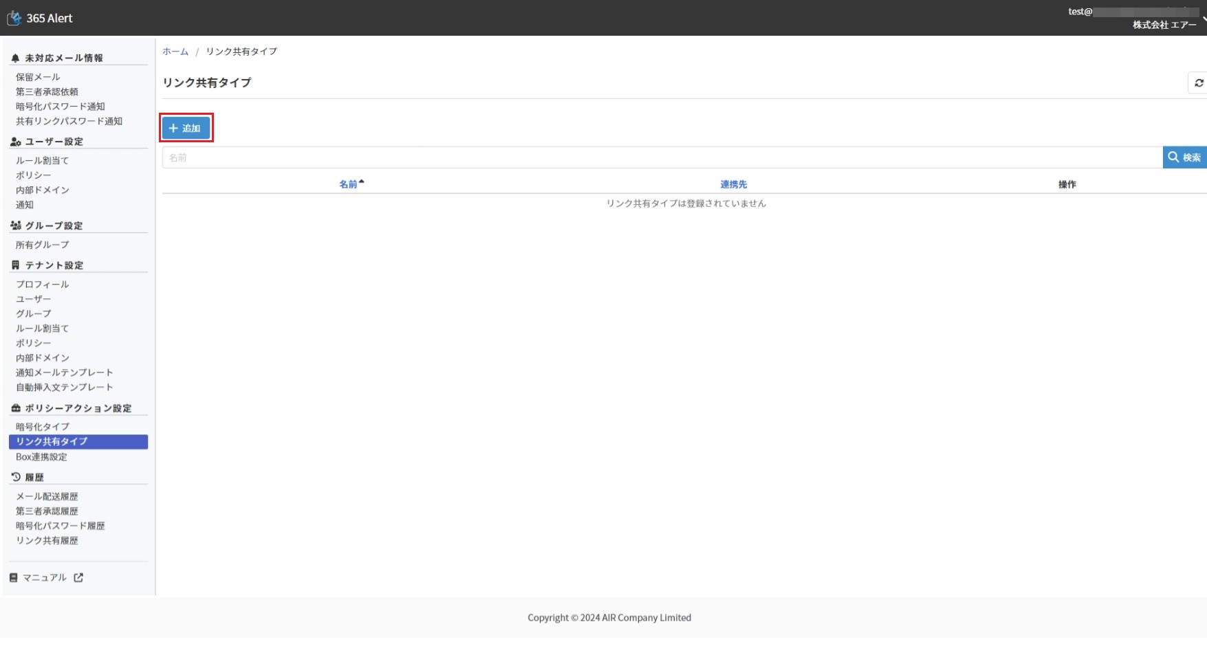 画面左のメニューから[ポリシーアクション設定]の[リンク共有タイプ]をクリックします。