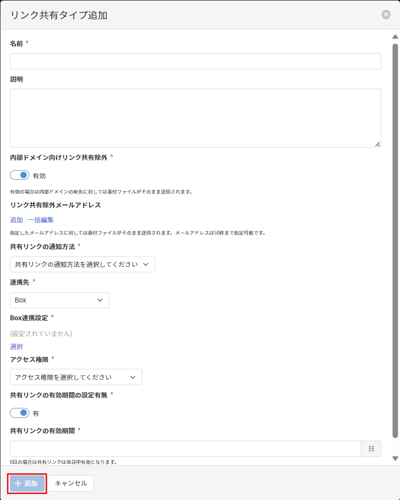 設定項目 説明 名前 リンク共有タイプのわかりやすい名前を指定します。名前は、リンク共有タイプ内で一意にする必要があります。 説明 リンク共有タイプのわかりやすい説明を指定します。 内部ドメイン向けリンク共有除外 内部ドメインの宛先に対しても添付ファイルをリンク共有するか否かを指定します。本設定が有効の場合は、内部ドメインの宛先に対しては添付ファイルがそのまま送信されます。 リンク共有除外メールアドレス 添付ファイルをリンク共有せず送信する宛先のメールアドレスを指定します。メールアドレスは50件まで指定可能です。メールアドレスは、 追加リンクをクリックして1件ずつ追加するか、一括編集リンクをクリックして一括で編集することが可能です。共有リンクの通知方法 共有リンクの通知方法を以下から選択します。 HTML形式の添付ファイル共有リンクが記載されたHTML形式のファイルを添付します。PDF形式の添付ファイル共有リンクが記載されたPDF形式のファイルを添付します。メール本文先頭メール本文の先頭に共有リンクを挿入します。メール本文末尾メール本文の末尾に共有リンクを挿入します。連携先 連携先のフ ァイルストレージを以下から選択します。 Box[連携先]が
