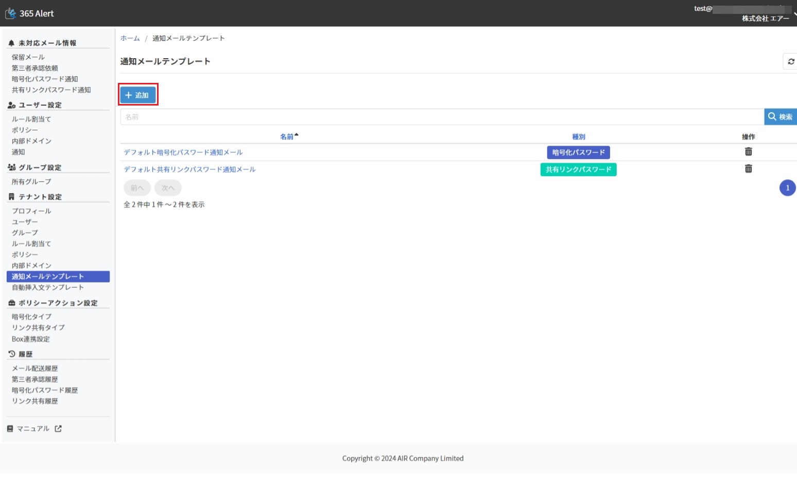 note初期状態では[デフォルト暗号化パスワード通知メール]と[デフォルト共有リンクパスワード通知メール]の2つの通知メールテンプレートが登録されています。新規に通知メールテンプレートを作成せず、こちらをご利用いただくことも可能です。