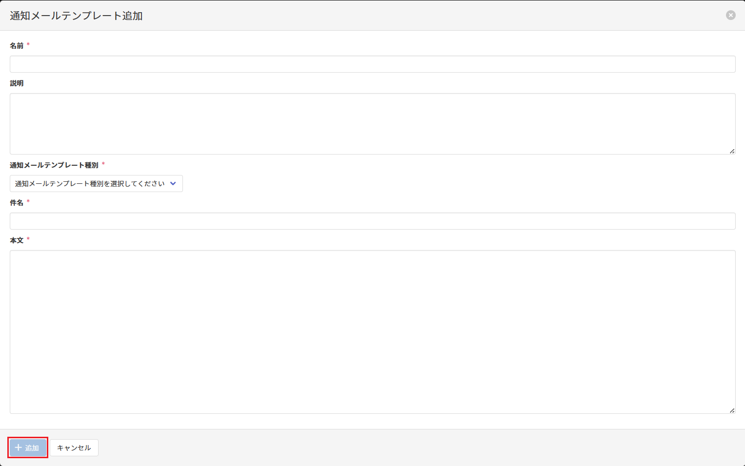 以下の画面が表示されますので、通知メールテンプレートを設定し[追加]をクリックします。
