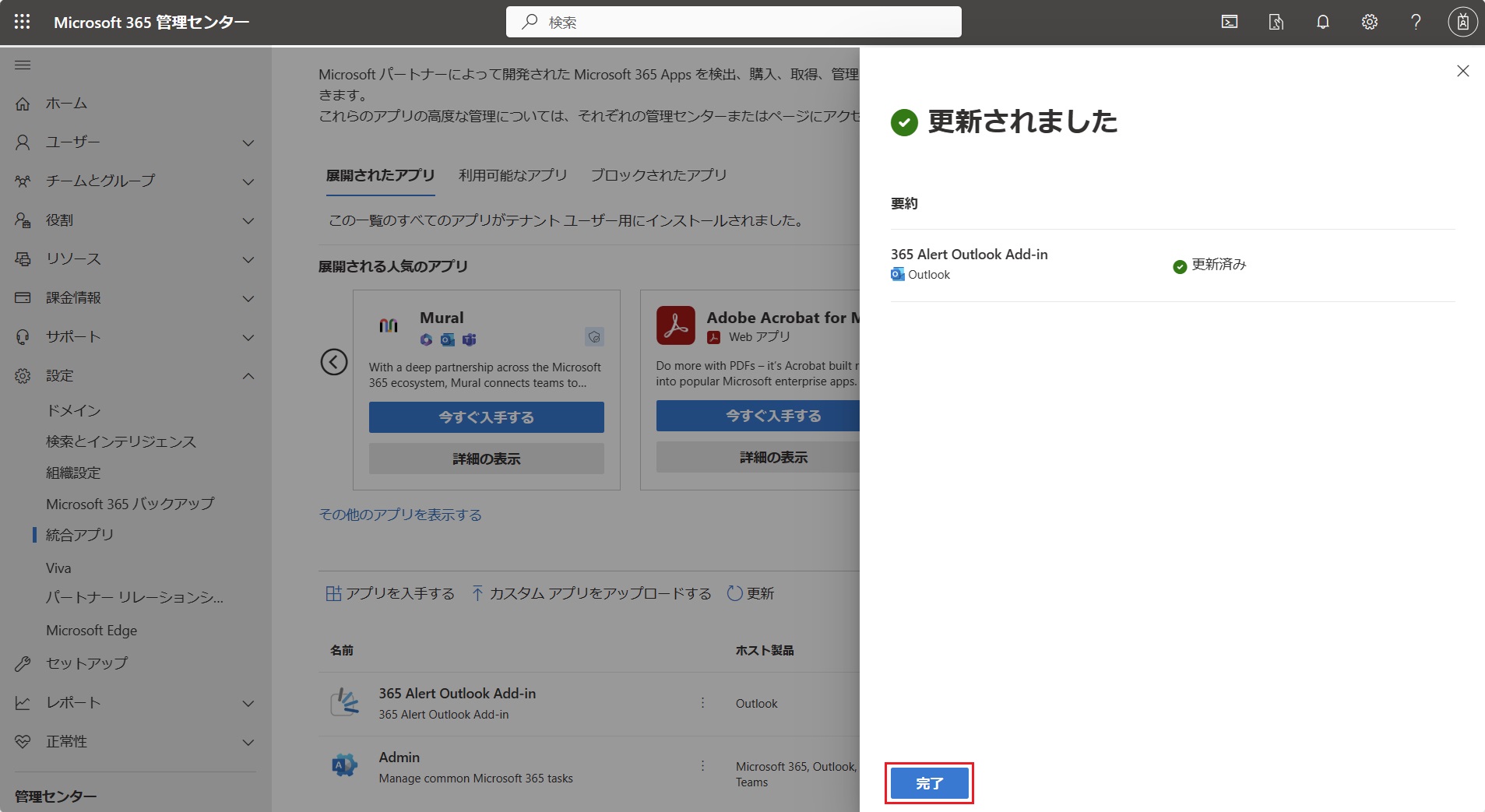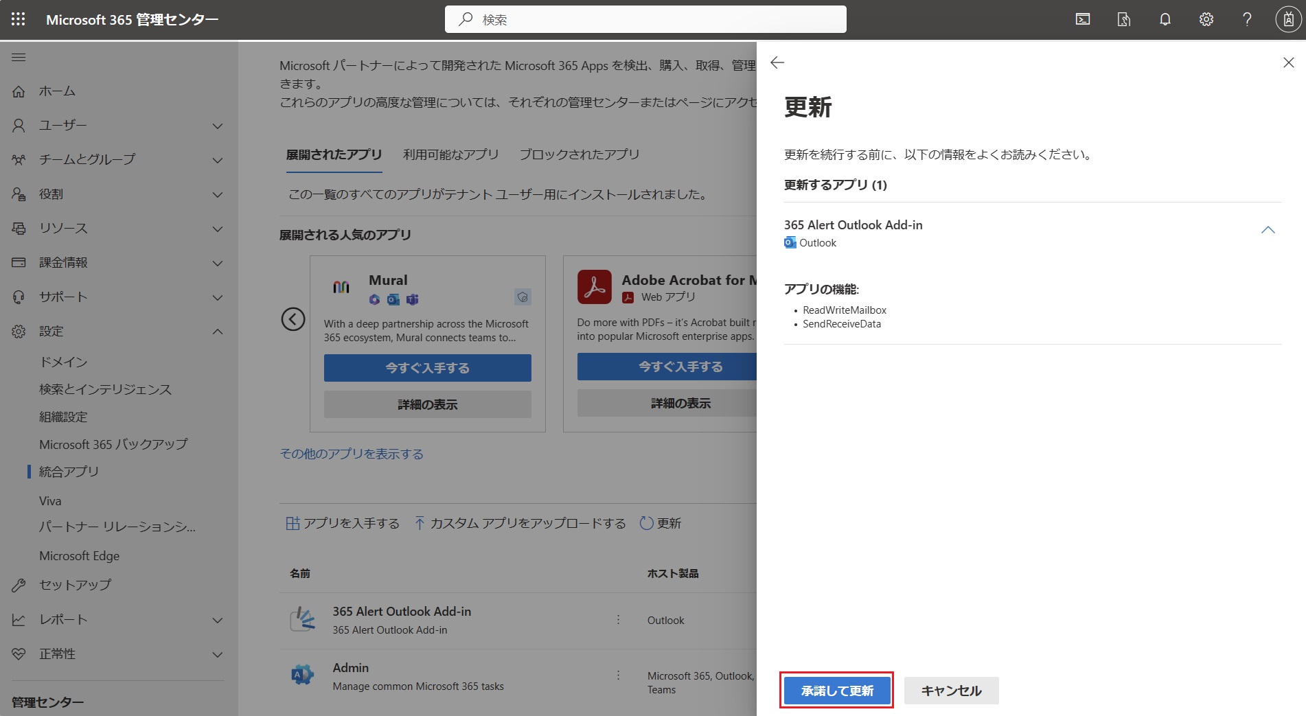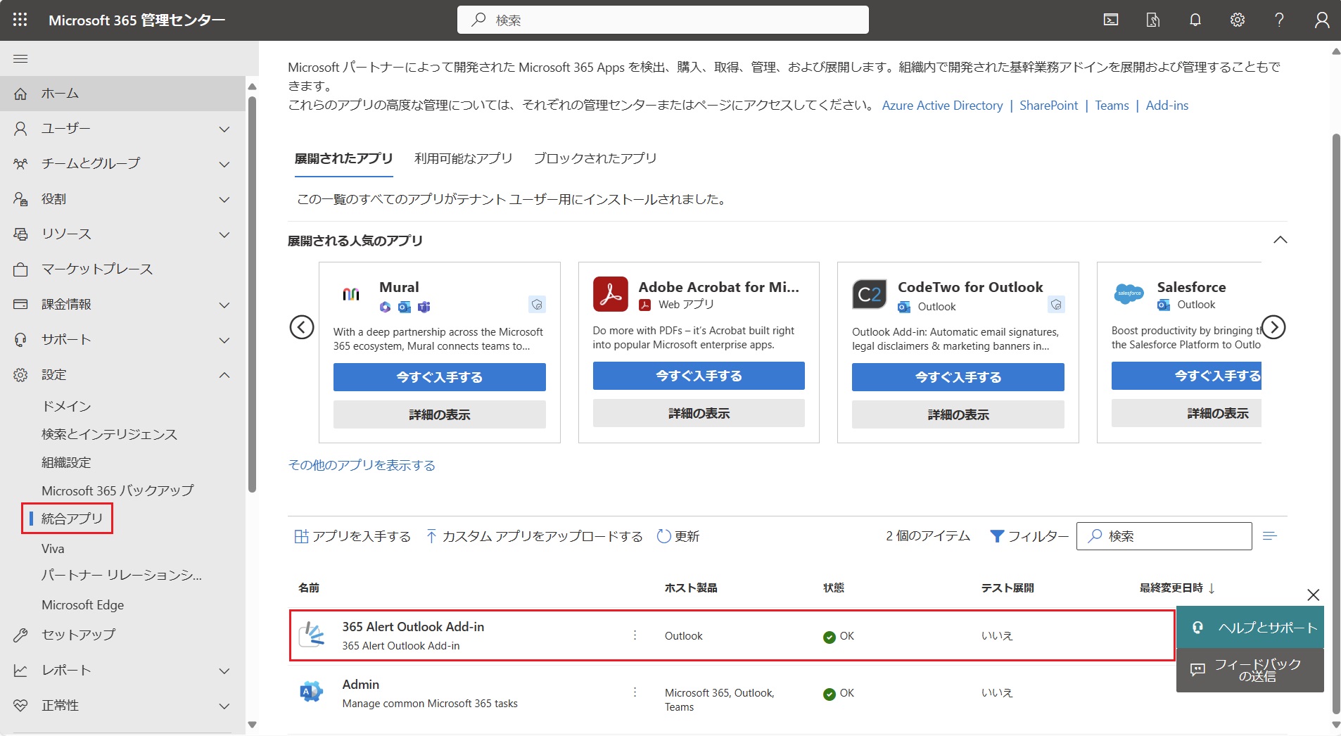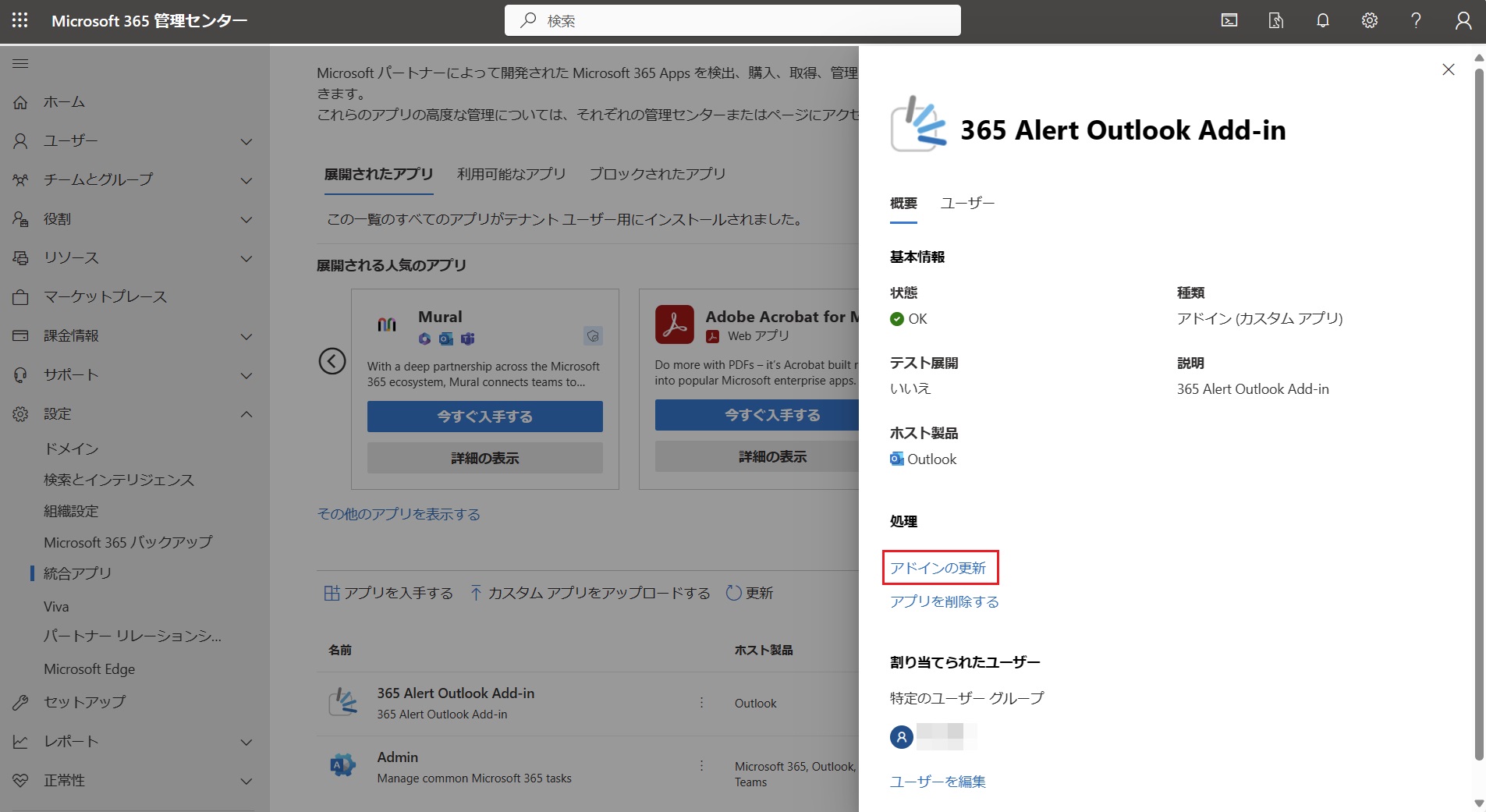 画面左のメニューから[設定]>[統合アプリ]をクリックします。表示された画面で名前が[365 Alert Outlook Add-in]の行をクリックします。