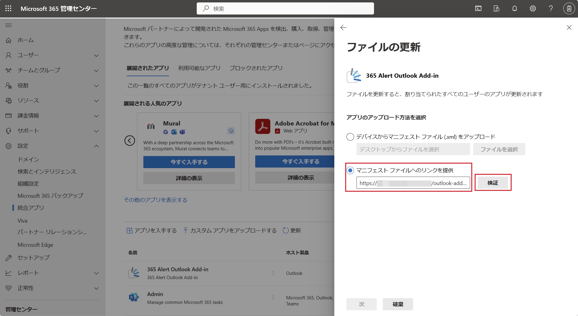 以下の画面で、[マニフェスト ファイルへのリンクを提供]を選択後、「Outlook Add-inマニフェストファイルURL」(取得方法は下記NOTE参照)を入力し、[検証]をクリックします。