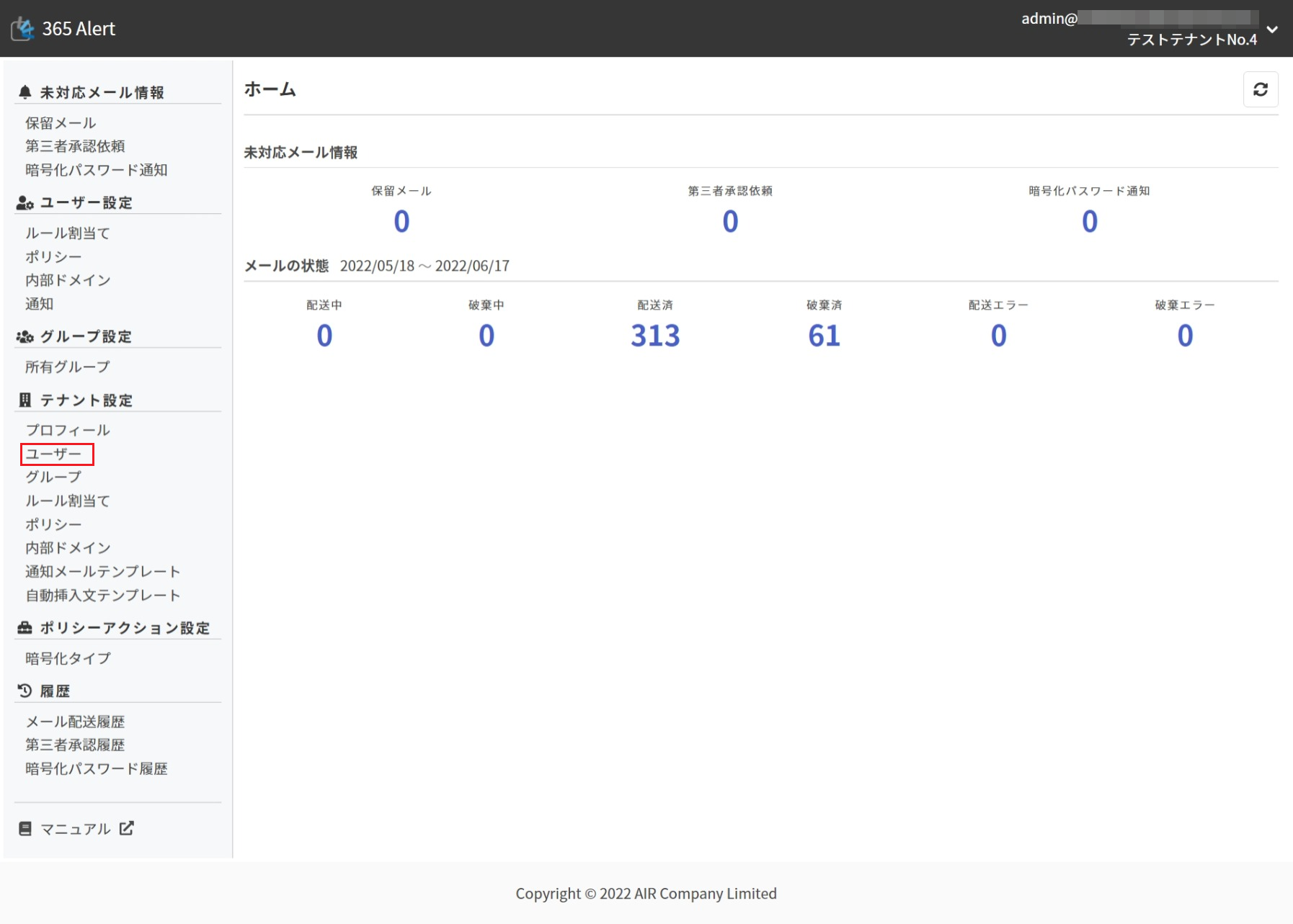 テナント管理者アカウントで、365 Alert管理ポータルにサインインします。サインイン方法はこちらを参照してください。