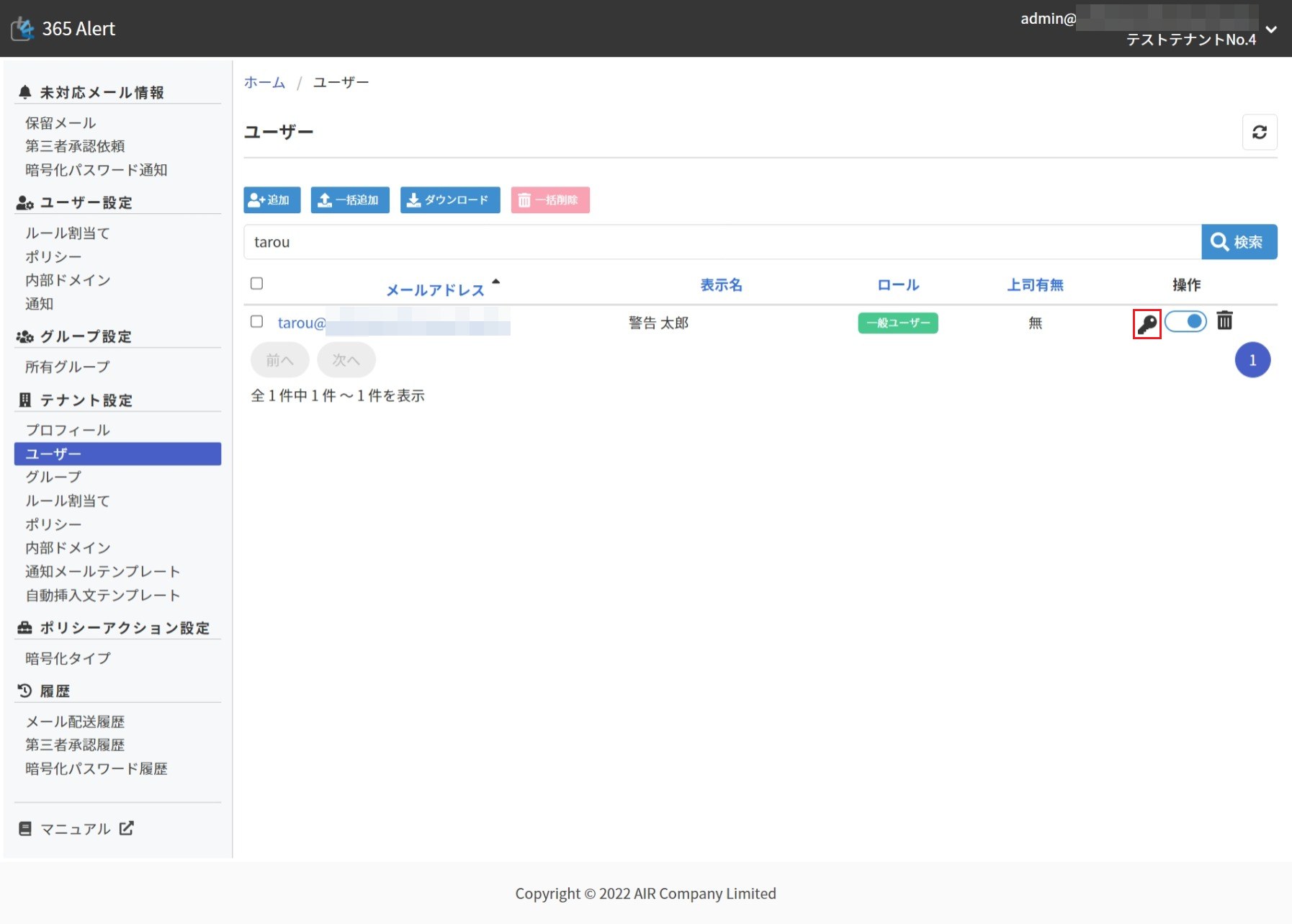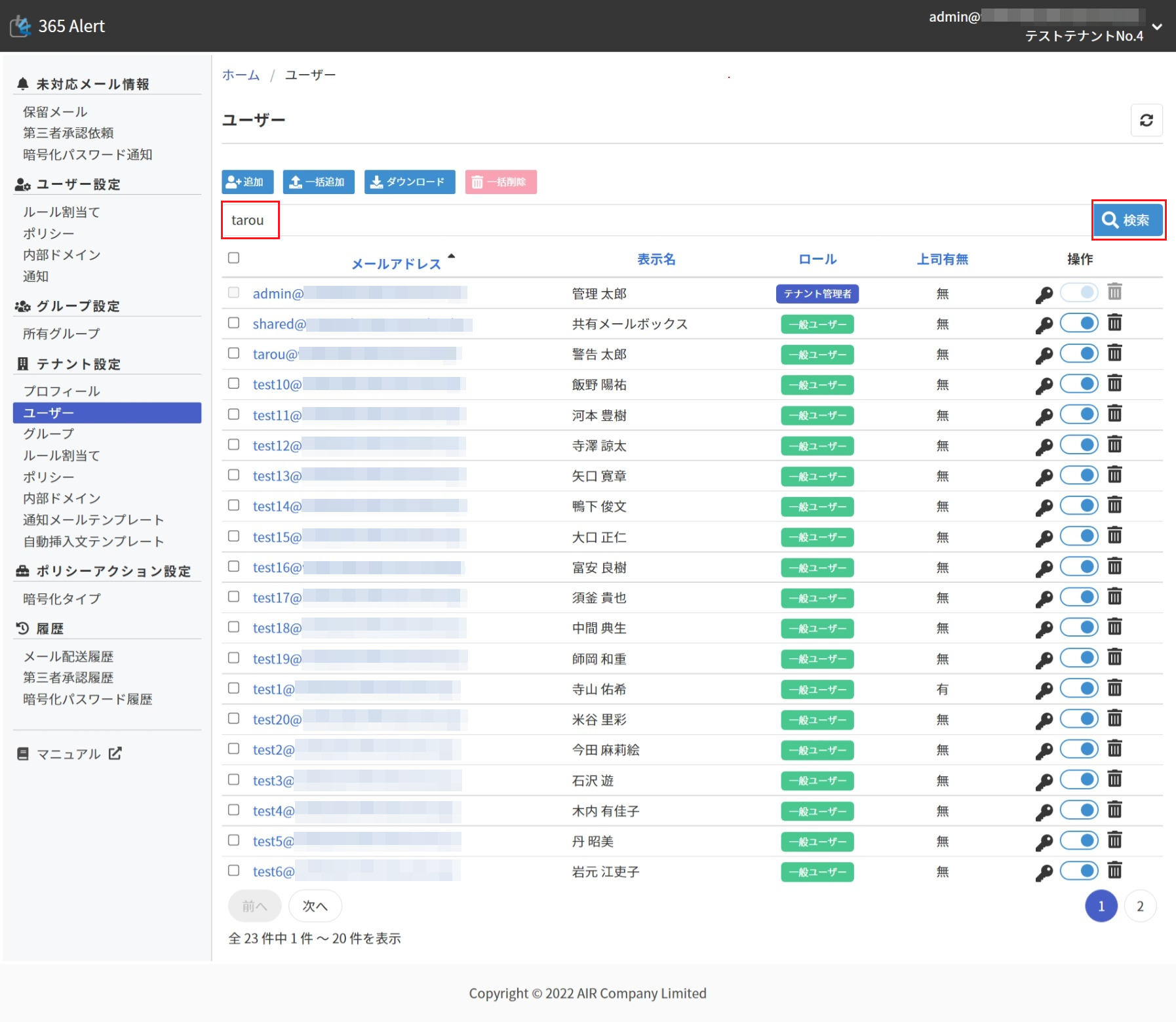 画面左のメニューから[テナント設定]の[ユーザー]をクリックします。