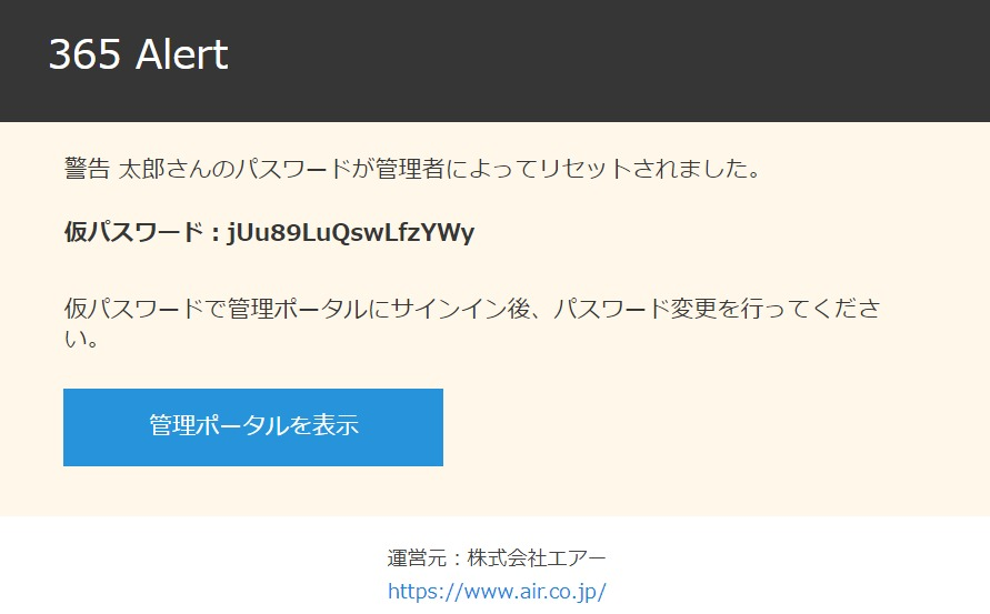 パスワードをリセットしたユーザーには仮パスワードが記載された以下の通知メールが届きます。