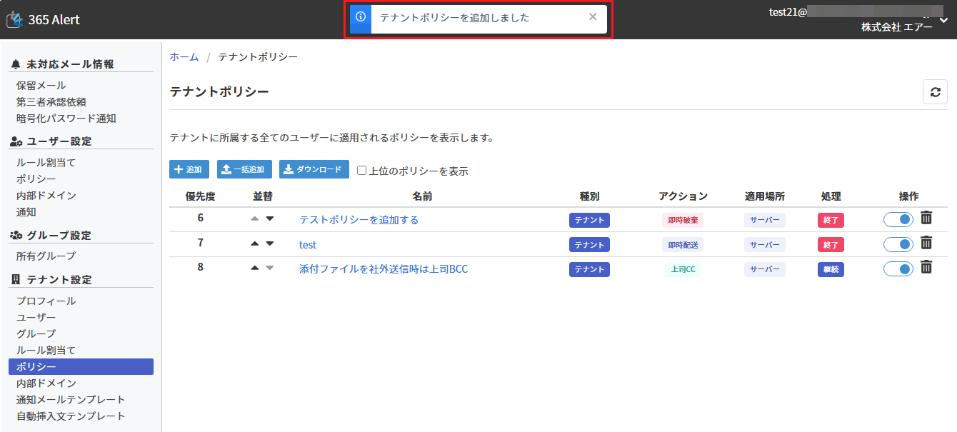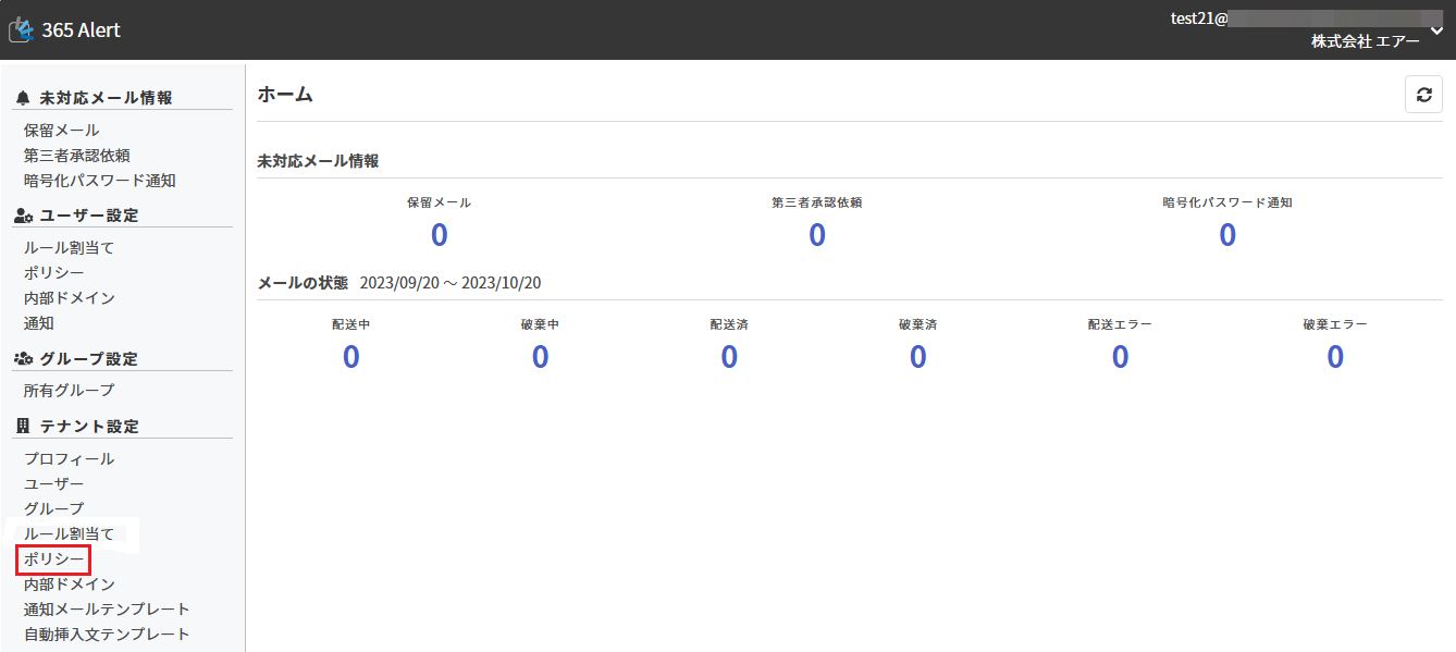 以下では テナントポリシー を設定する手順を、「社外宛ての添付ファイル付きメールは上司にBCCする」ケースを例として記載します。 テナントポリシーはテナント管理者アカウントが設定可能です。