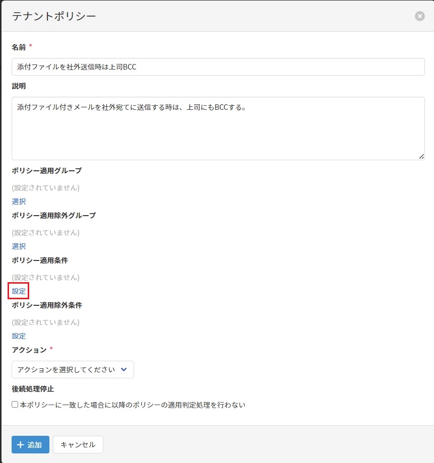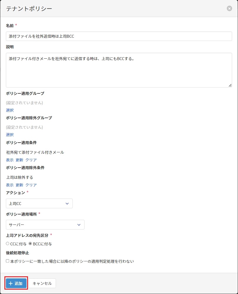 以下の画面が表示されますので、[アクション]と[ポリシー適用]と[上司アドレスの宛先区分]を選択し、[追加]をクリックします。
