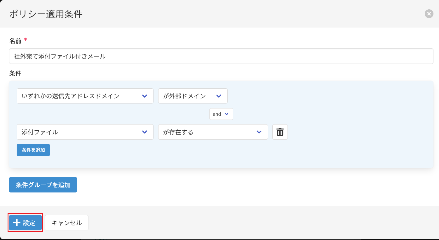 以下の画面が表示されますので、[社外宛て添付ファイル付きメール]の条件を入力し[設定]をクリッ クします。
