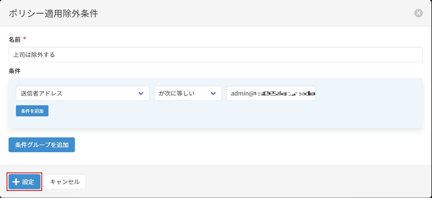 以下の画面が表示されますので、[上司は除外する]条件を入力し[設定]をクリックします。