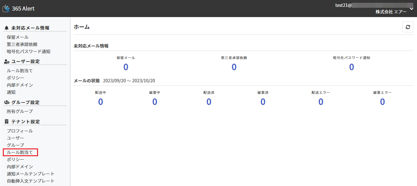 以下では テナントルールを設定する手順を、「添付ファイルありの メールを保留する」ケースを例として記載します。テナントルールはテナント管理者アカウントが設定可能です。