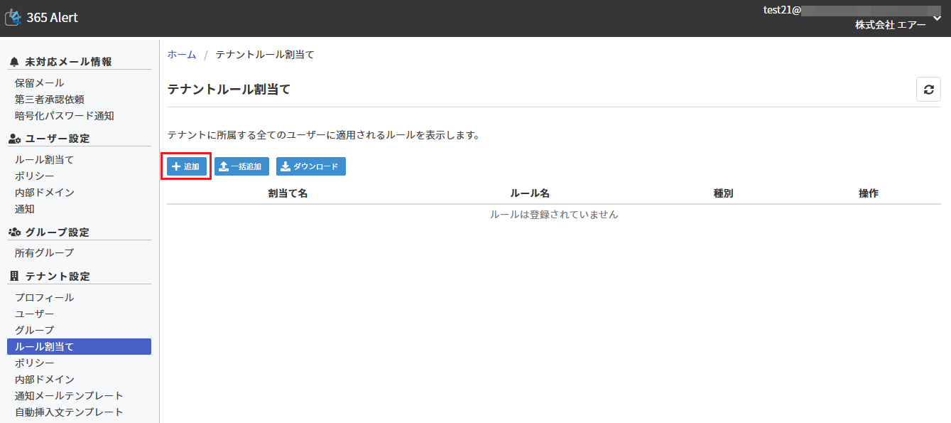 画面左のメニューから[テナント設定]の[ルール割当て]をクリックします。