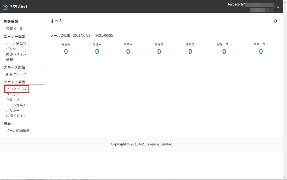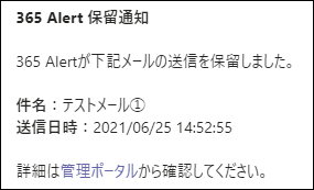 管理者マニュアルTeams通知形式の変更On this pageTeams通知形式の変更Teams通知形式は、以下の2種類から選択可能です。 カード形式 Teams上で宛先確認と配送・破棄処理が可能です。 テキスト形式 簡易な表示形式で、宛先確認や配送・破棄処理は、「365 Alert管理ポータル」から行います。 Teams通知形式の変更手順 テナント管理者アカウントで、365 Alert管理ポータルにサインインします。サインイン方法はこちらを参照してください。 画面左のメニューから[テナント設定]の[プロフィール]をクリックします。 以下の画面で、Teams通知形式を選択して、[プロフィール更新]をクリックします。