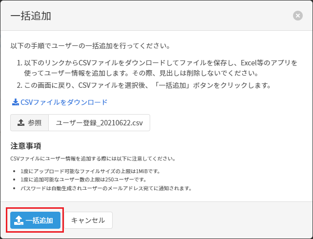 ダウンロードしたCSVファイルをExcel等で開き、登録するユーザーを追記して、任意のCSVファイル名で保存します。