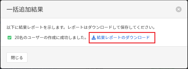 結果レポートをダウンロード後、[閉じる]をクリックします。