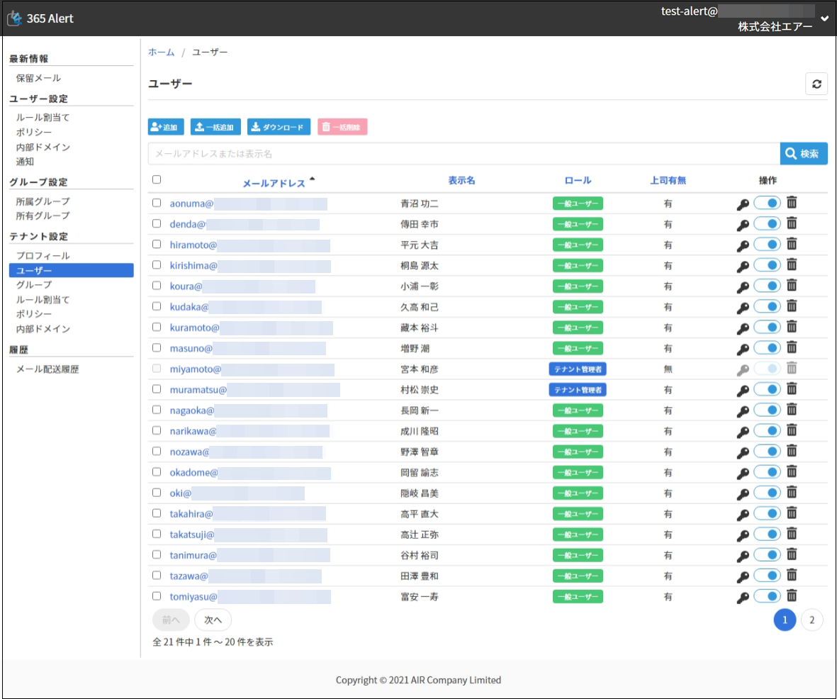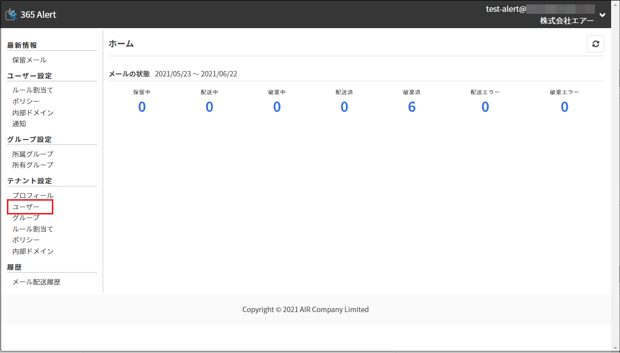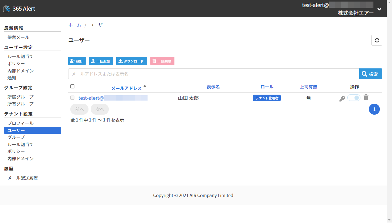 テナント管理者アカウントで、365 Alert管理ポータルにサインインします。サインイン方法はこちらを参照してください。