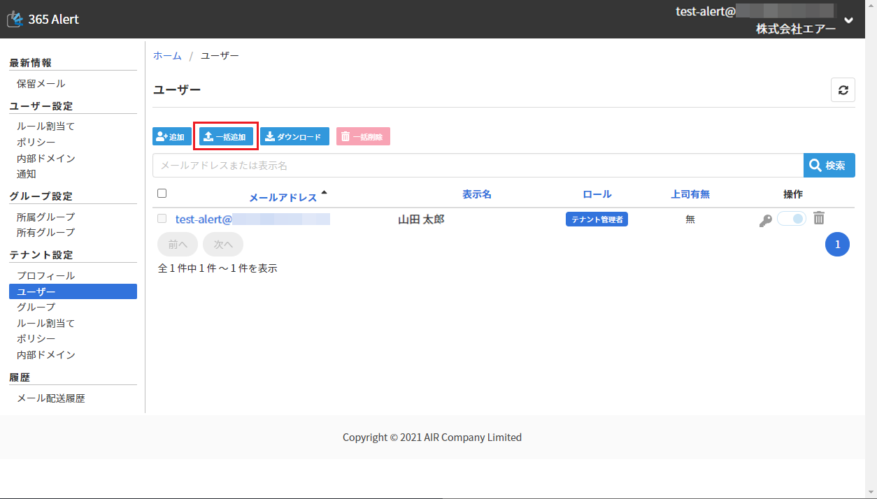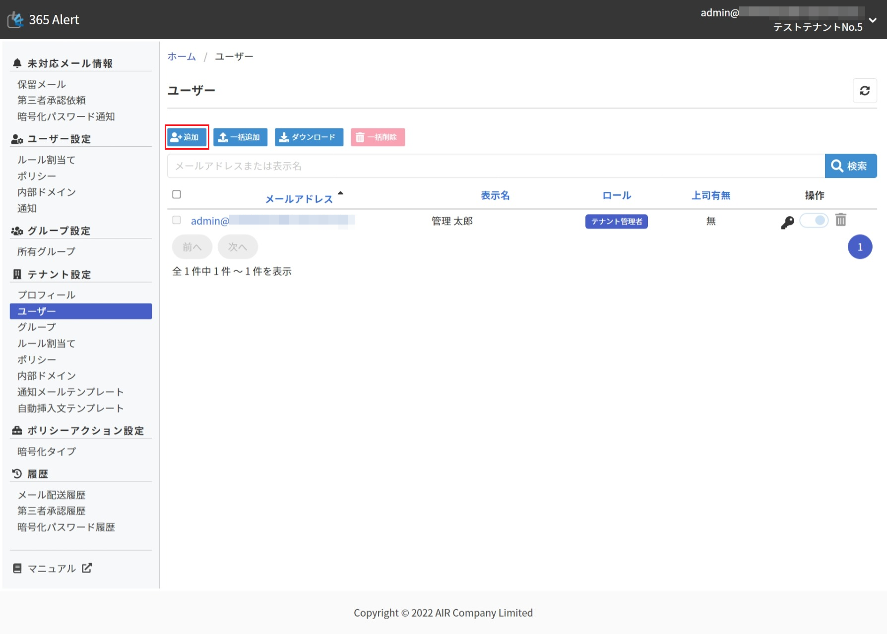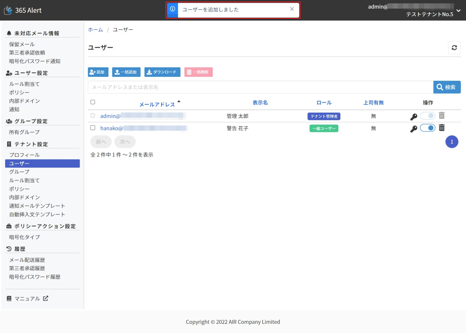 - メールアドレスのドメインはテナントに登録されているドメインであること。