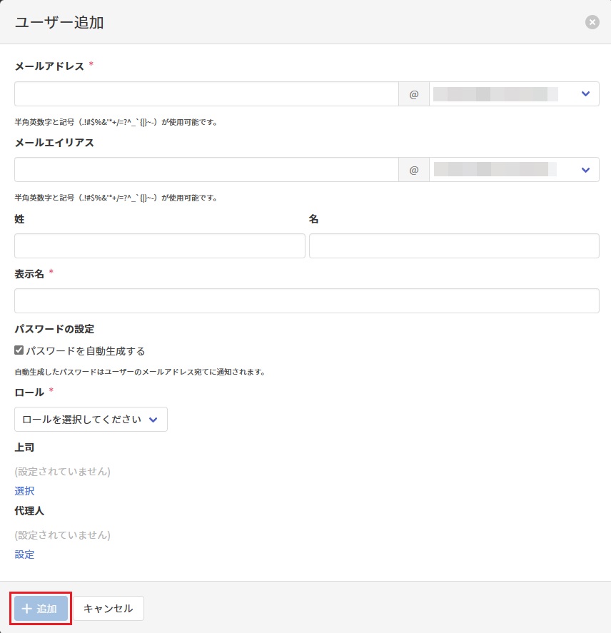 例) 一般ユーザー10 上司 上司を選択します。上司の設定についてはこちらを参照してください。 11 代理人 代理人を選択します。代理人の設定についてはこちらを参照してください。 ※ 「パスワードを自動生成する」にチェックをしなかった場合は必須項目