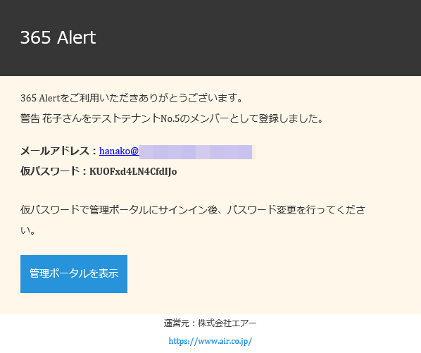 note「パスワードを自動生成する」にチェックをすると、登録したユーザーに仮パスワードを通知する下記のメールが送信されます。