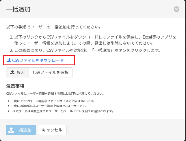 CSVファイルをダウンロード後、[キャンセル]をクリックして、一旦画面を閉じます。