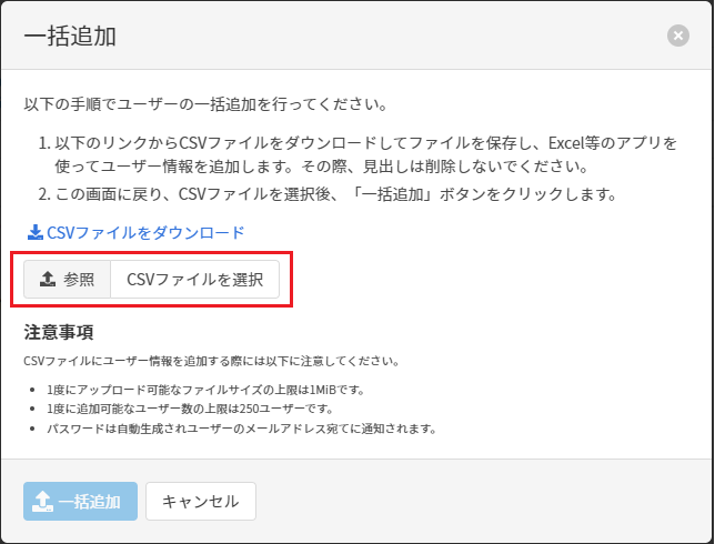 以下の画面で[参照 CSVファイルを選択]をクリックし、3.で作成したCSVファイルを選択して、[開く]をクリックします。