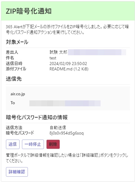 ※ [送信方法]が自動送信または手動送信の時のみ表示されます。詳細確認 ブラウザで管理ポータルが開きます。 暗号化パスワード通知が送信もしくは削除されると、Teams通知が以下の内容に更新されます。