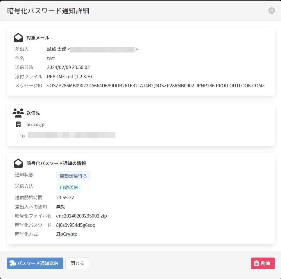 [送信方法]が自動送信または手動送信の場合は、以下の画面が表示され、暗号化パスワード通知情報の確認、暗号化パスワード通知の送信、削除処理を行うことが可能です。