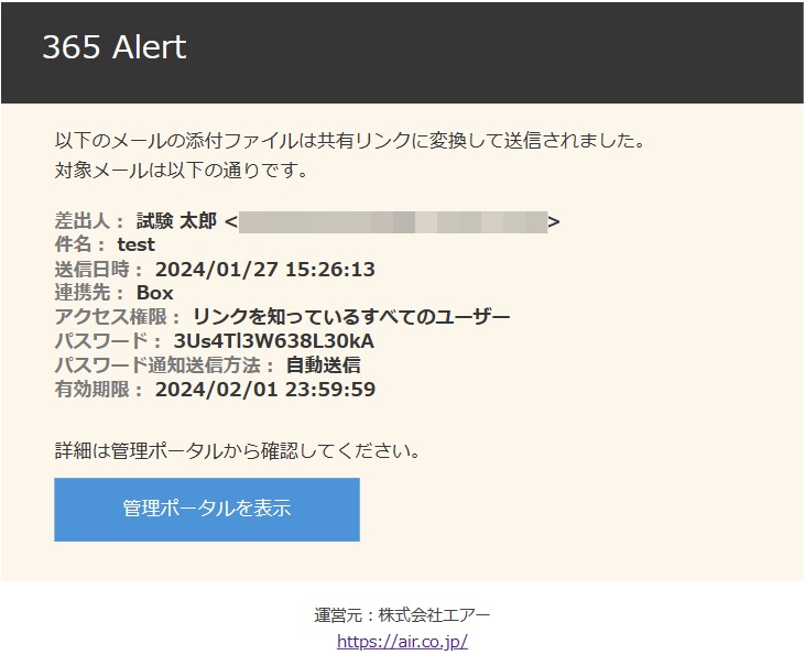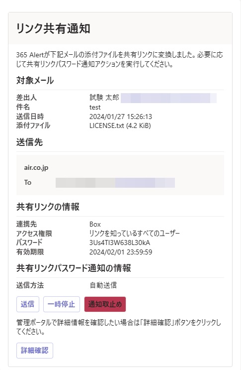 ※ [送信方法]が自動送信または手動送信の時のみ表示されます。詳細確認 ブラウ ザで管理ポータルが開きます。 共有リンクパスワード通知が送信もしくは通知取止めされると、Teams通知が以下の内容に更新されます。