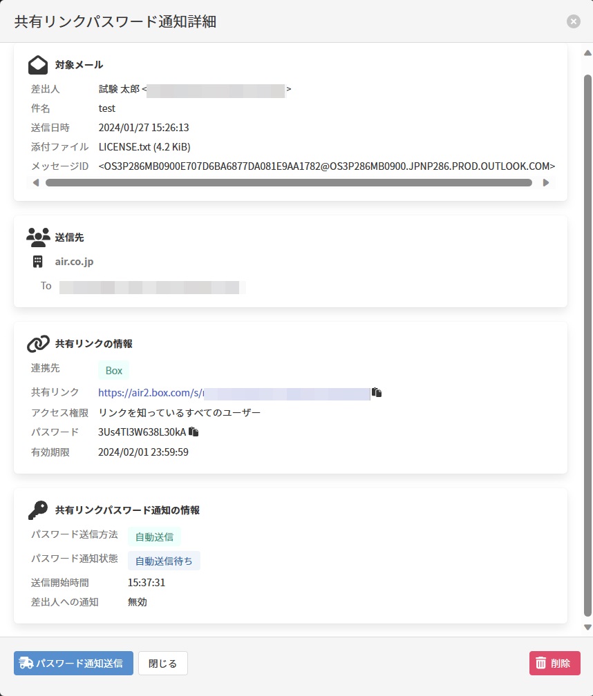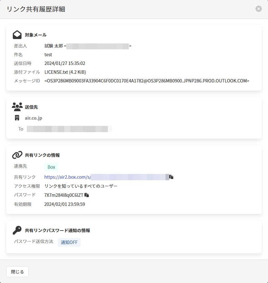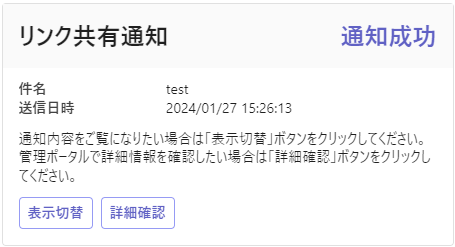 ボタン クリック時の動作 送信 共有リンクパスワード通知を送信します。