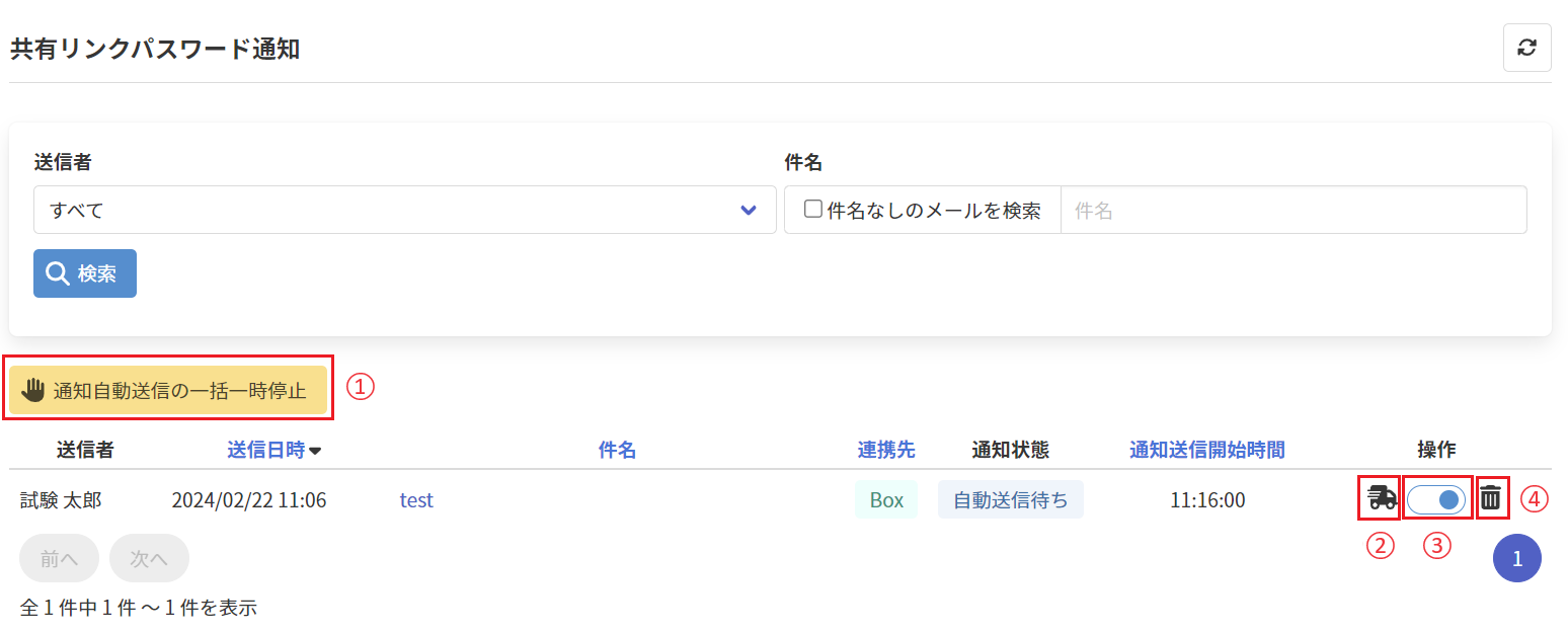 ※ [送信方法]が自動送信または手動送信の時のみ表示されます。一時停止 共有リンクパスワード通知の自動送信を一時停止します。