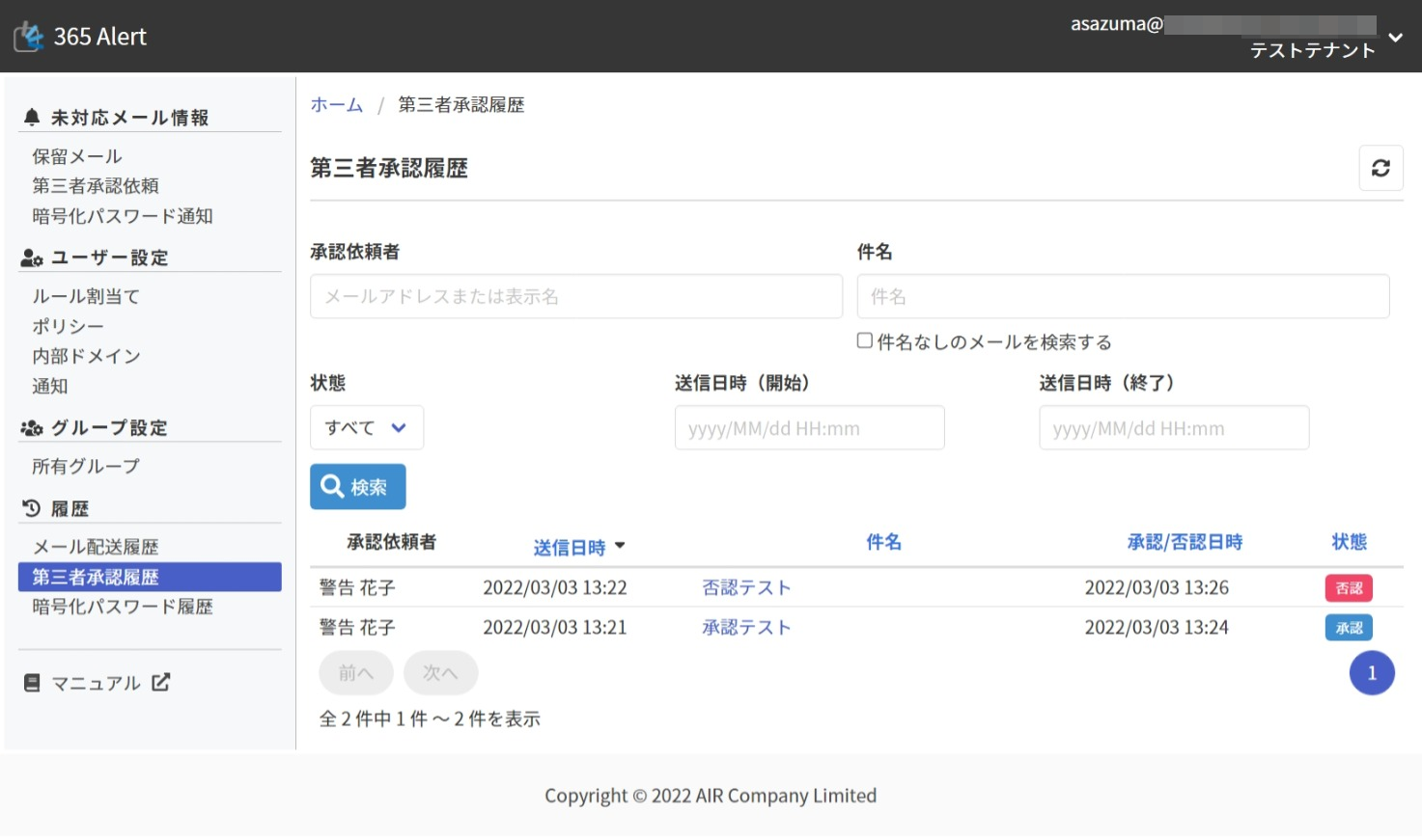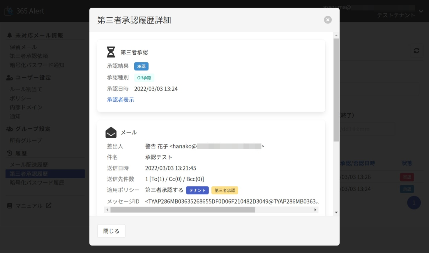 過去に承認/否認したメールの履歴は管理ポータルの第三者承認履歴画面で確認できます。履歴の保存期間は30日間です。