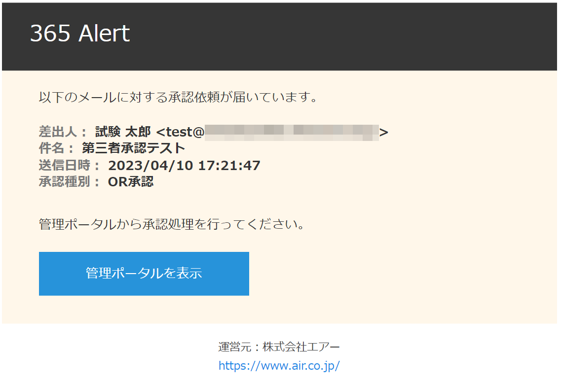 以下の内容の通知メールが届きます。件名は「第三者承認依頼: