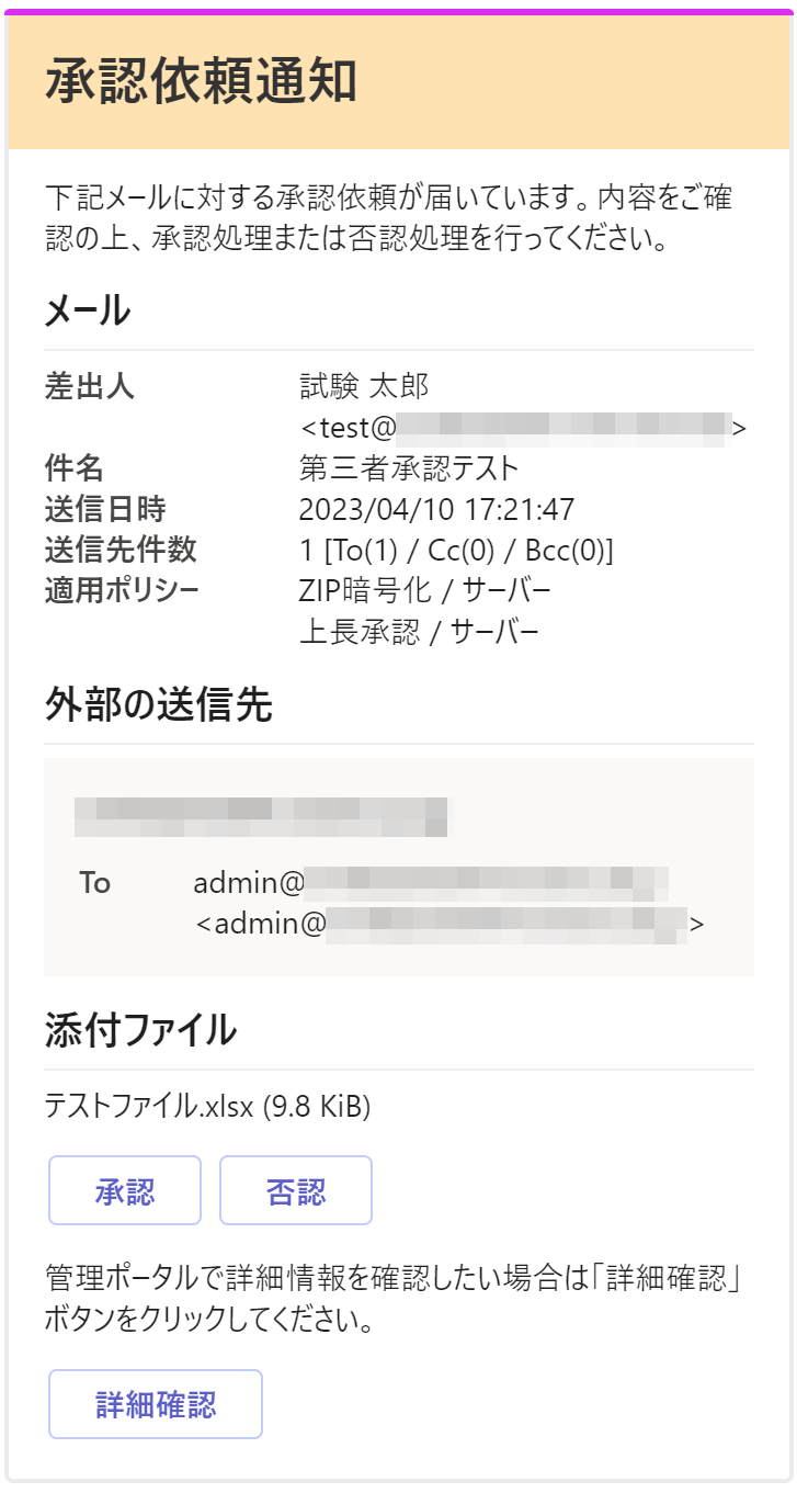 [詳細確認]ボタンをクリックするとブラウザで管理ポータルの第三者承認依頼詳細画面が開きます。